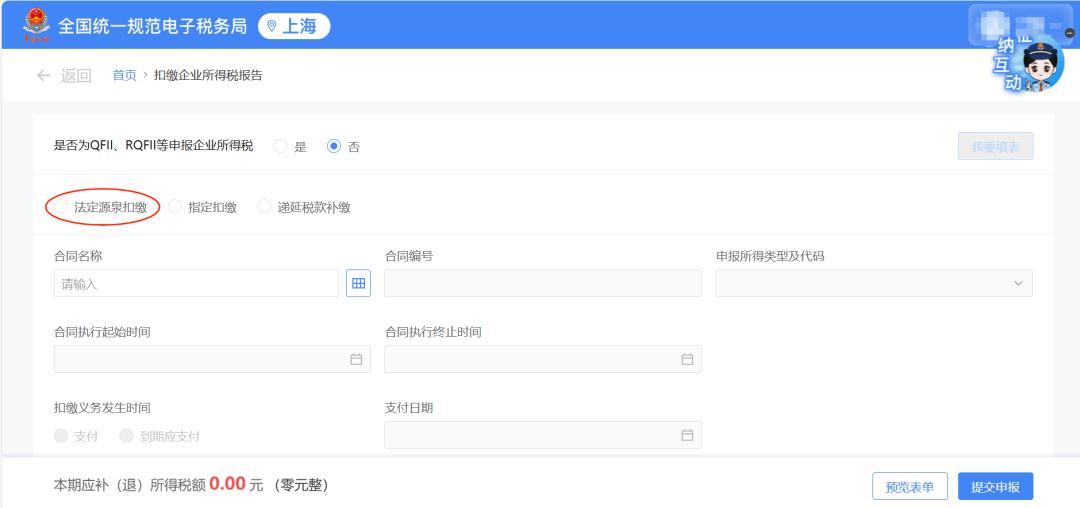 登录新电子税局,进入“我要办税”模块,选择“税费申报及缴纳”选项,选择“企业所得税申报”然后进入“代扣企业所得税报告”界面,点击法定源泉扣缴。