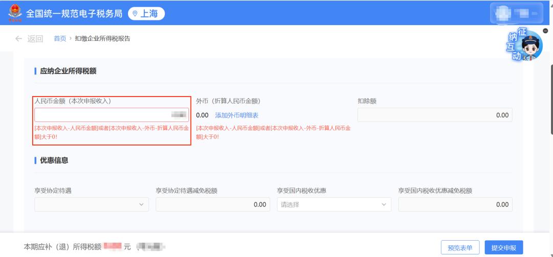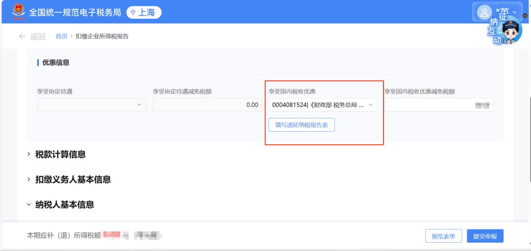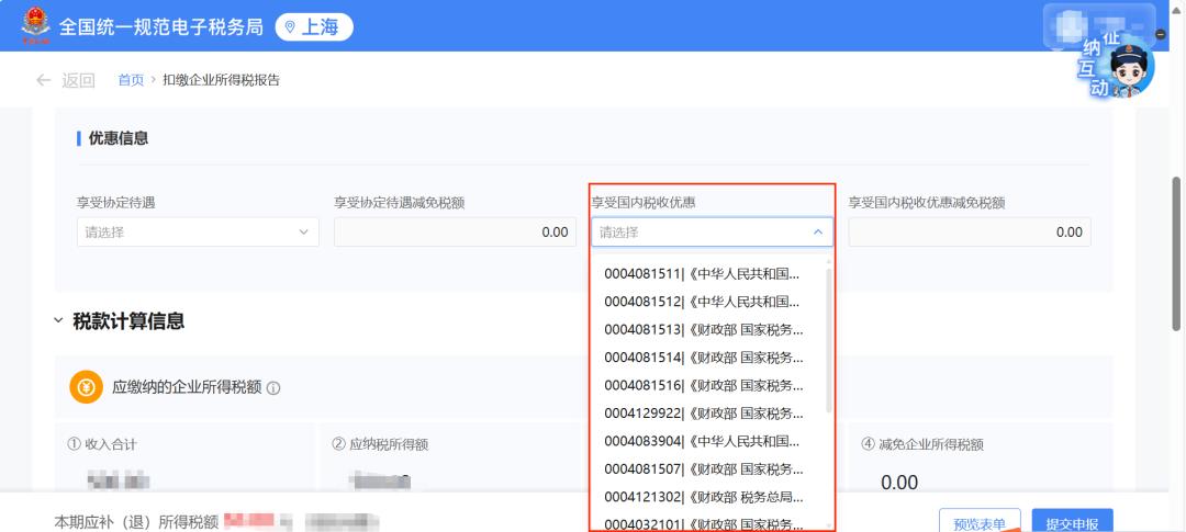 1.选择相应享受国内税收优惠政策,填报减免税额。