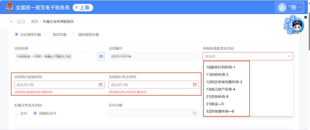 3.正式填写扣缴企业所得税报告,选择申报类型,合同执行起始时间。