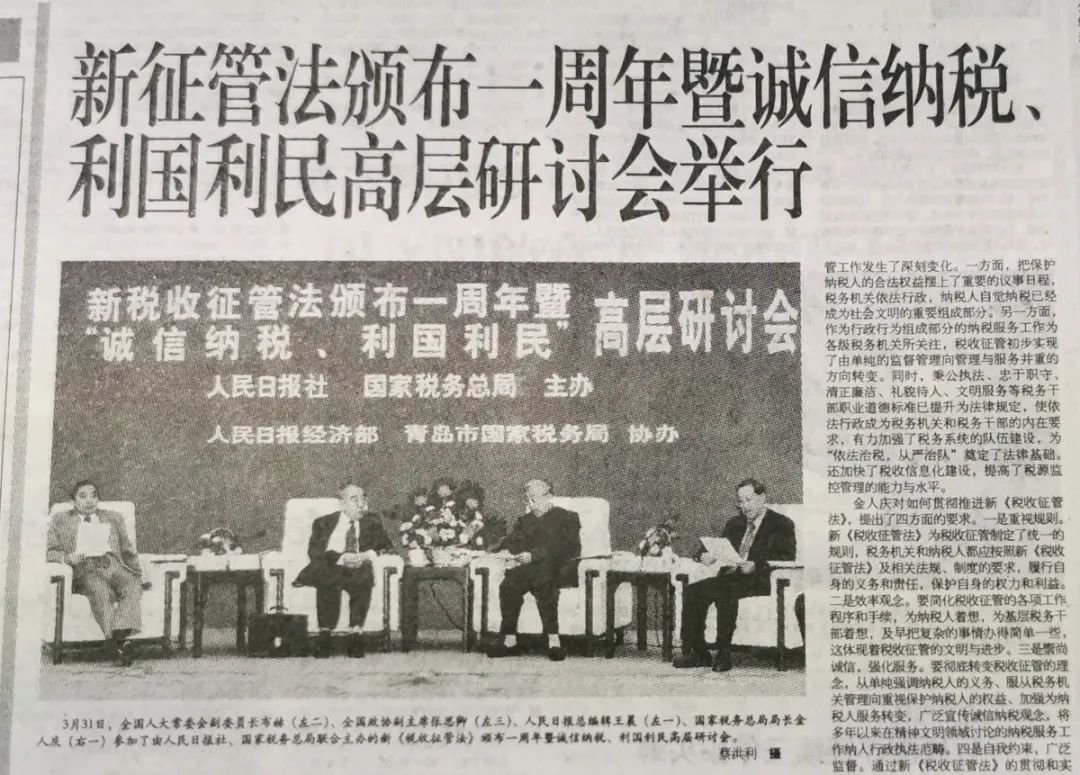 2002年3月31日,由人民日报社、国家税务总局联合主办的新税收征管法颁布一周年暨诚信纳税、利国利民高层研讨会举行。