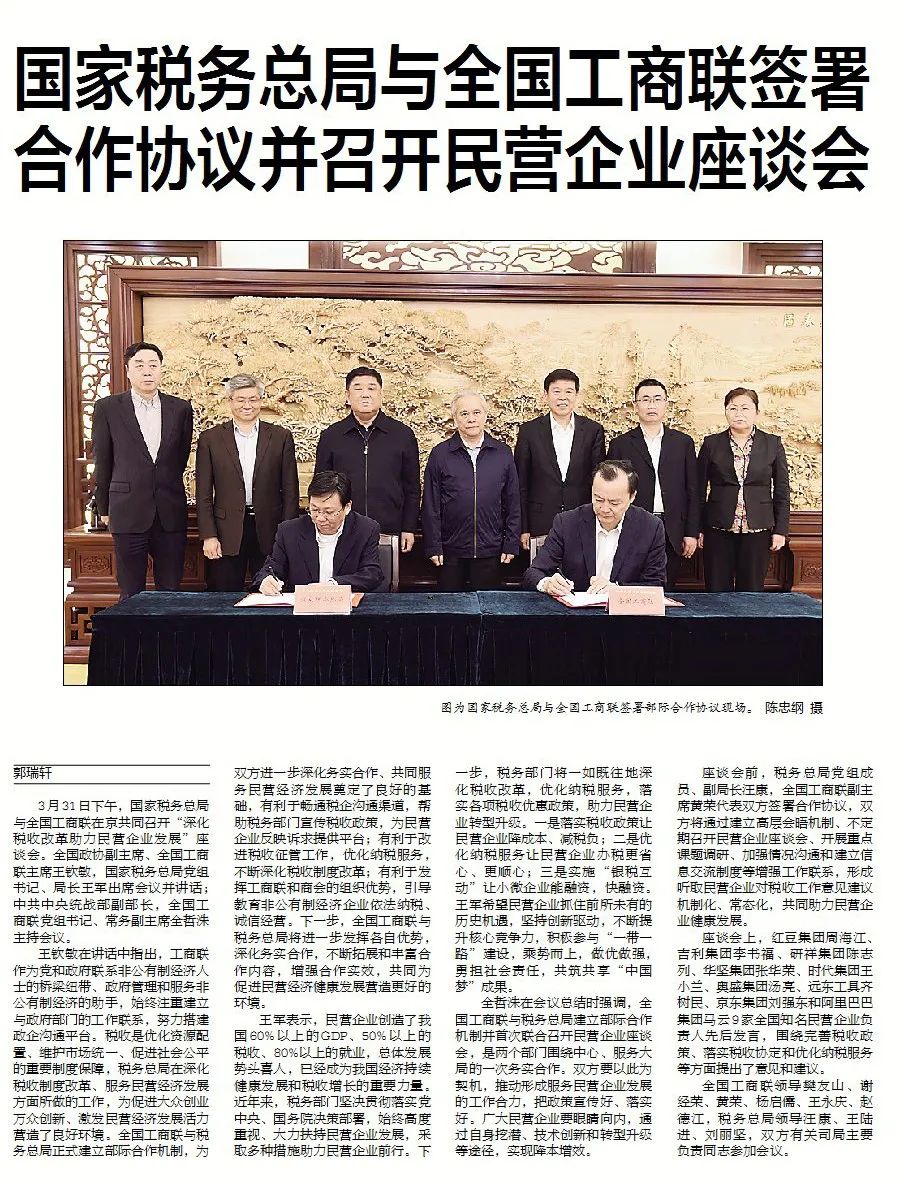 2017年3月31日,税务总局与全国工商联在京共同召开“深化税收改革助力民营企业发展”座谈会,正式签署合作协议,商定了包括建立高层会晤机制、不定期召开民营企业座谈会、开展重点课题调研、加强情况沟通、建立信息交流制度等5条措施,为第26个全国税收宣传月活动拉开了序幕。