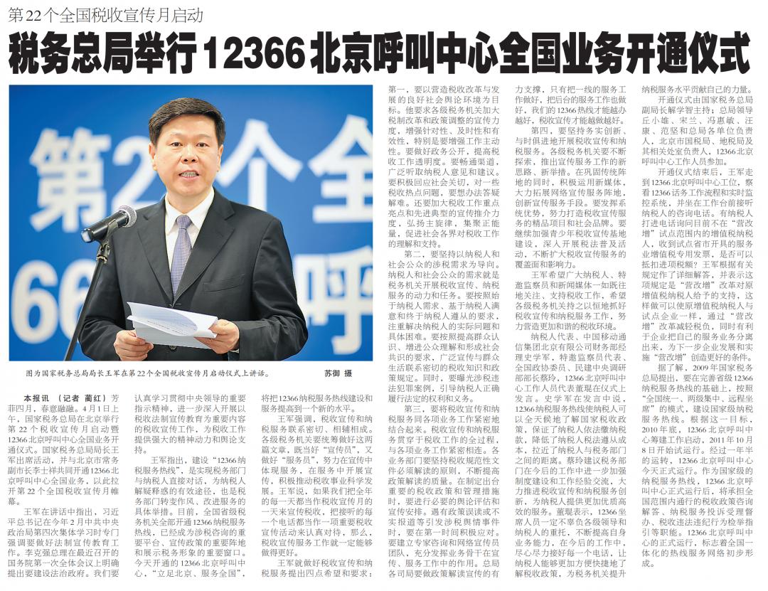 “进一步深入开展以税收法制宣传教育为重要内容的税收宣传工作,为税收工作提供强大的精神动力和舆论支持。”“统筹做好税收宣传和纳税服务两篇文章,既当好‘宣传员’,又做好‘服务员’。”2013年4月1日,国家税务总局局长王军在第22个税收宣传月启动暨12366北京呼叫中心全国业务开通仪式上,对全国税收宣传月活动提出新要求。