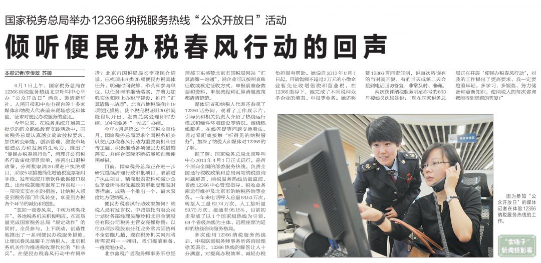 2014年4月1日,国家税务总局在12366纳税服务热线北京呼叫中心举办“公众开放日”活动。图为参加“公众开放日”的媒体记者在体验12366纳税服务热线的工作。