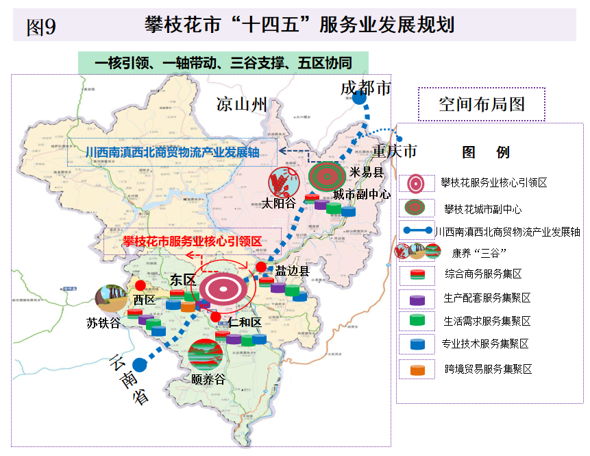 5.“一核引领、一轴带动、三谷支撑、五区协同”。一核:攀枝花市现代服务业核心功能区(东区中心城区和钒钛高新区干坝塘片区);一轴:川西南滇西北商贸物流产业轴;三谷:康养产业的“苏铁谷”“颐养谷”和“太阳谷”;五区协同:围绕现代生产性服务集聚区、专业技术服务集聚区、综合商务服务集聚区、生活需求服务集聚区、跨境贸易服务集聚区实现协同发展。