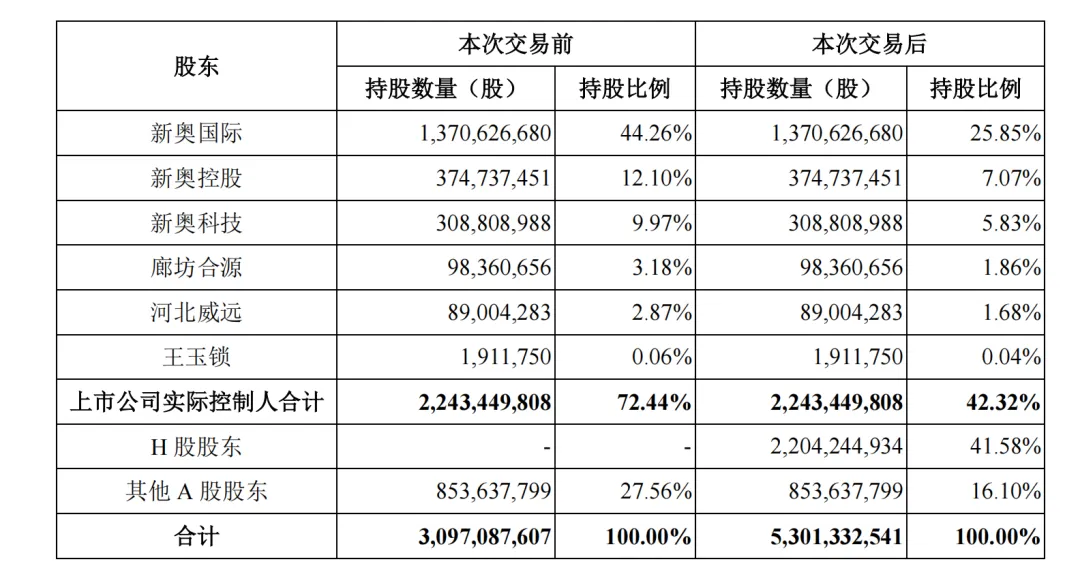 本次交易前,新奥股份间接持有新奥能源34.28%股权;本次交易完成后,新奥能源将成为新奥股份100%控制的下属企业。王玉锁直接及通过新奥国际及其一致行动人合计持有新奥股份的股权比例由72.44%降至42.32%,但仍为实控人。