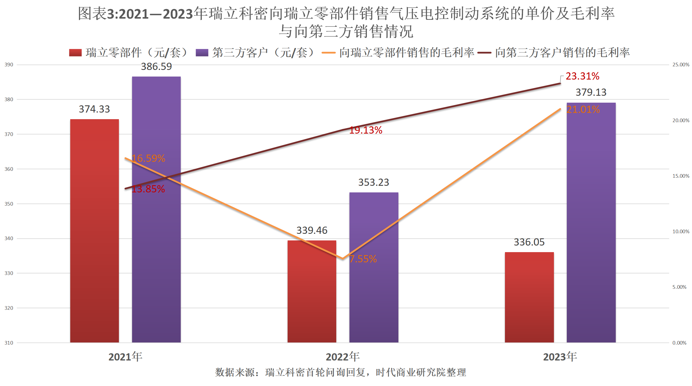 其中,2021—2023年,瑞立科密向瑞立零部件销售的气压电控制动系统成套单价分别为617.18元/套、781.15元/套、1476.04元/套,而对第三方客户销售的成套单价分别为655.29元/套、786.73元/套、951.10元/套。由此计算,瑞立科密向瑞立零部件销售气压电控制动系统的单价相当于第三方客户的94.18%、99.29%、155.19%,即除了2023年,其他年份均低于第三方客户。