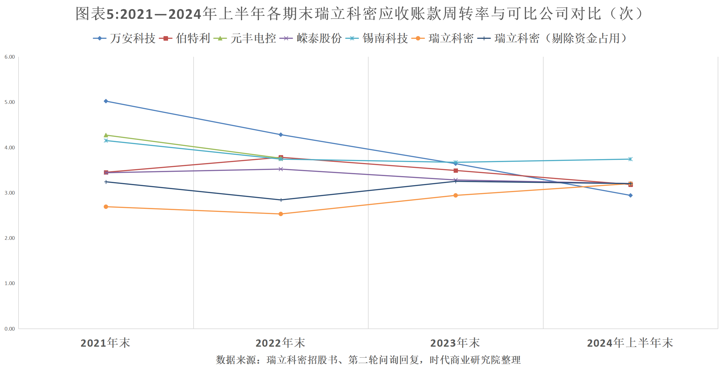 瑞立科密将万安科技(002590.SZ)、伯特利(603596.SH)、元丰电控(IPO终止)、嵘泰股份(605133.SH)、锡南科技(301170.SZ)列为可比公司。招股书显示,2021—2024年上半年各期末,瑞立科密的应收账款周转率分别为2.69次/年、2.53次/年、2.94次/年、3.20次/年,同行业可比公司的应收账款周转率均值分别为4.06次/年、3.82次/年、3.52次/年、3.27次/年,均高于瑞立科密,但是差距有所收窄。