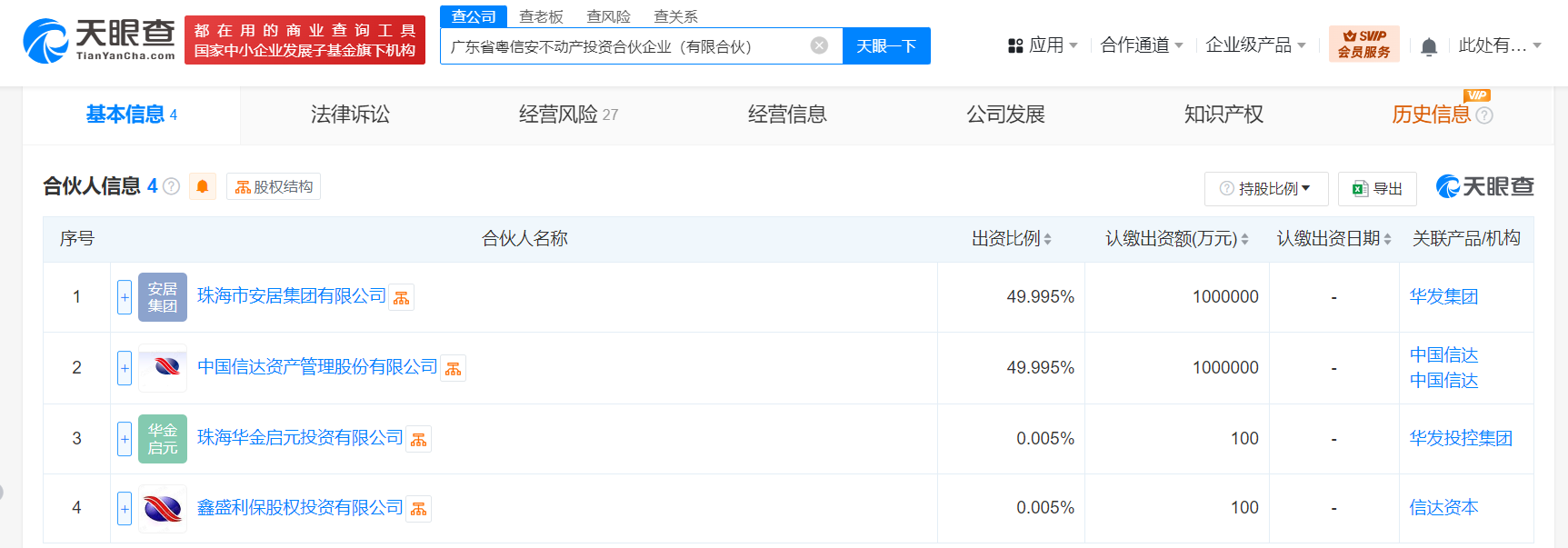 每经AI快讯,天眼查App显示,近日,广东省粤信安不动产投资合伙企业(有限合伙)成立,执行事务合伙人为鑫盛利保股权投资有限公司,出资额200.02亿元,经营范围为房地产咨询、以自有资金从事投资活动、企业管理。合伙人信息显示,该企业由珠海华发集团旗下珠海市安居集团有限公司、珠海华金启元投资有限公司、中国信达及旗下鑫盛利保股权投资有限公司共同出资。