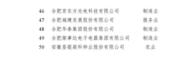 新上榜企业有5户,分别是:蔚来汽车销售服务有限公司(7位)、通威太阳能(合肥)有限公司(10位)、晶科能源(肥东)有限公司(38位)、合肥城建发展股份有限公司(47位)、荃银高科种业股份有限公司(50位)。