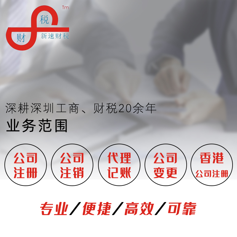 深圳新速财税(咨询电话:400-9987-263)全称(深圳市新速企业会计代理有限公司)提供广东省深圳市罗湖区,福田区,南山区,宝安区,光明新区,龙华区,龙岗区,大鹏新区,盐田区、东莞市、中山市、广州市、香港等范围内中小企业的深圳公司注册,深圳公司变更,公司代理记账,增资,减资,经营范围变更,深圳公司注销、出口退税等相关业务