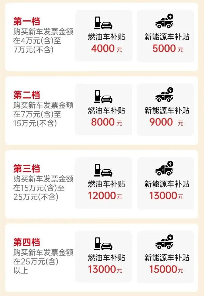 符合条件的新能源车补贴2万元,燃油车补贴1.5万元。