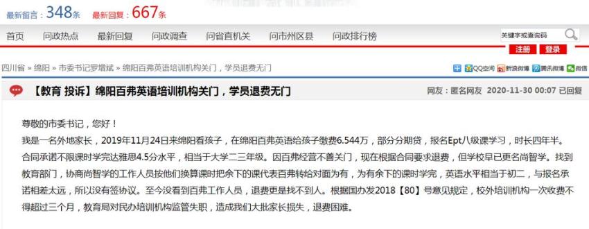 有网友向问政四川投诉,他在绵阳百弗英语给孩子缴费6.5万报名英语专业课学习,时长四年半。后该门店经营不善关门,直接把网友剩余的课程转给了另一家培训机构,但教学标准比当初签协议的时候差了很多。该家长表示,至今没看到百弗工作人员,也找不到人退费。