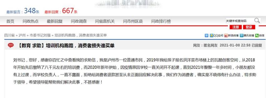 近日,有学生家长通过四川日报全媒体民情热线(028-86968696)和问政四川平台反映,部分知名校外培训机构仍一次性收取超过3个月的学费。