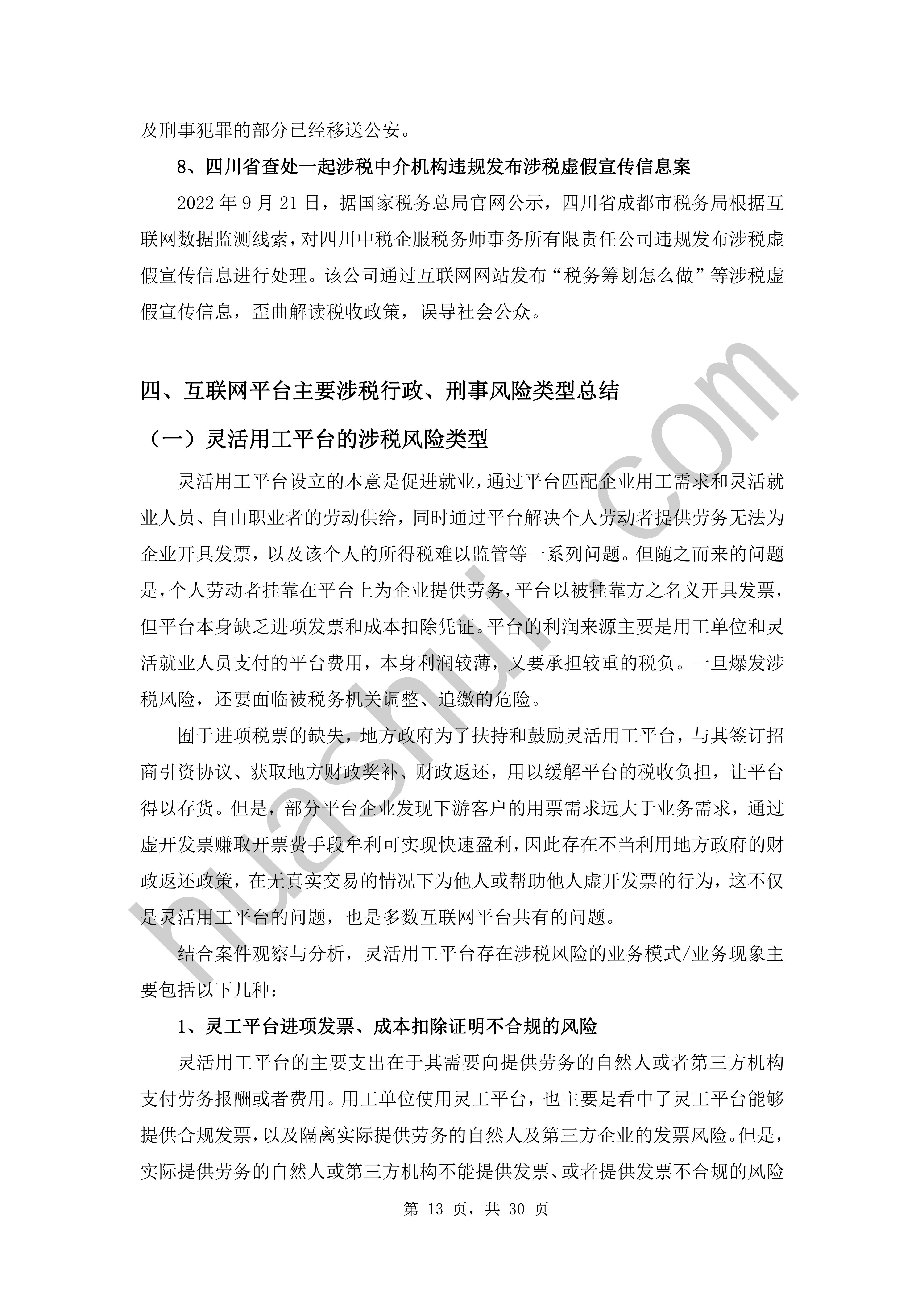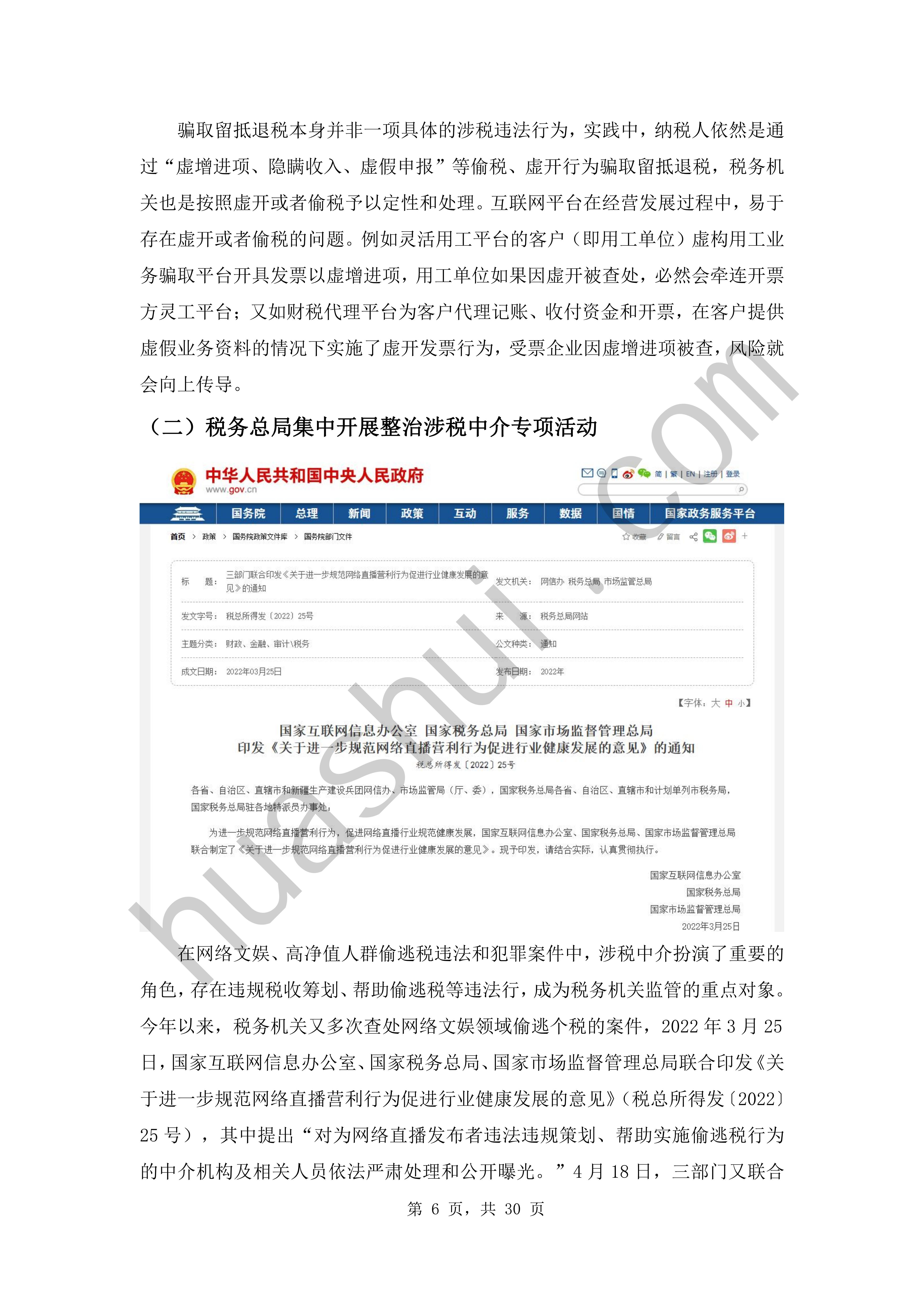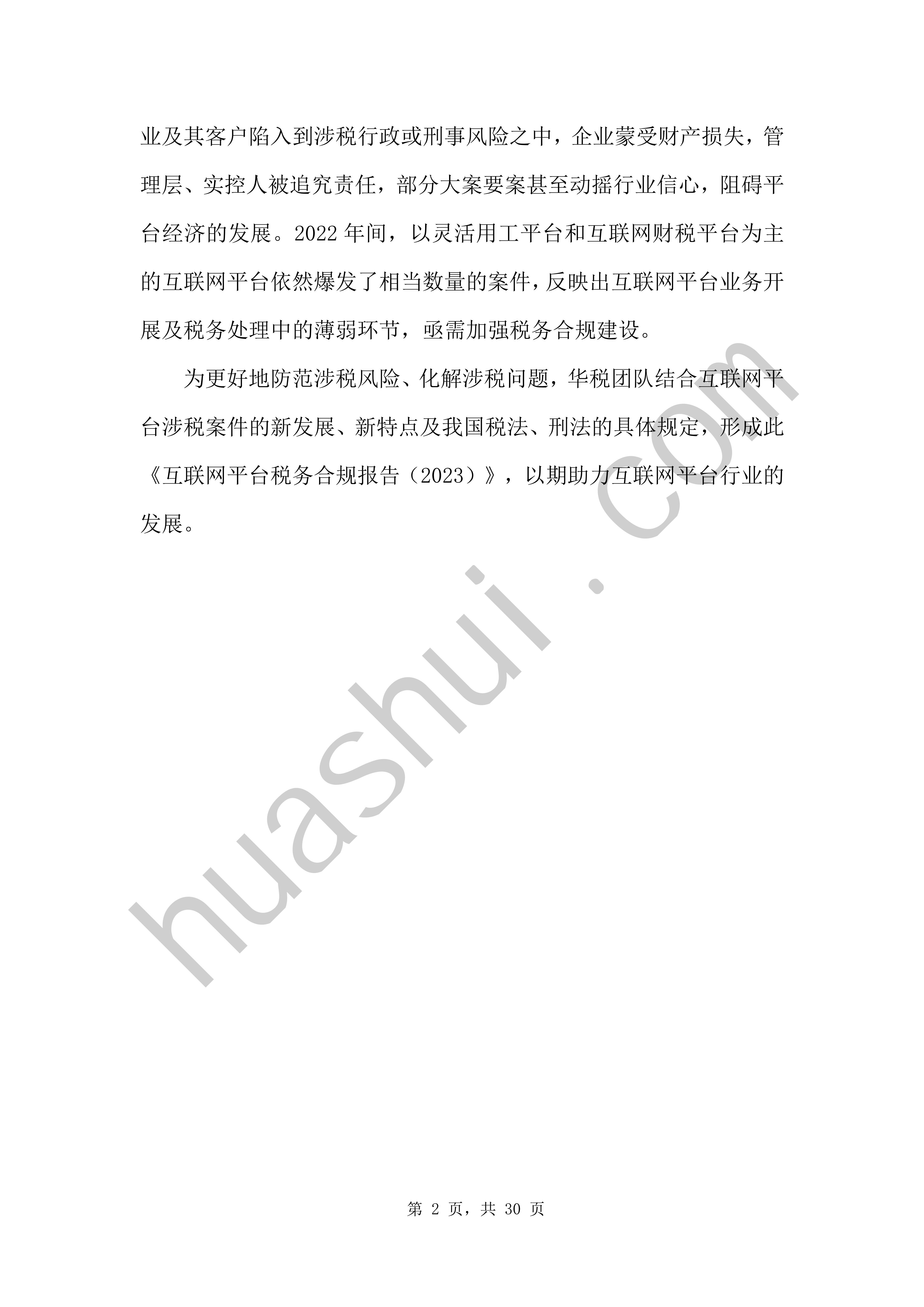 2022年12月26日,中央经济工作会议明确提出“要大力发展数字经济,提升常态化监管水平,支持平台企业在引领发展、创造就业、国际竞争中大显身手。”随着技术的进步、平台经济的进一步发展,平台助力实业的能力会更上层楼,推动传统行业的信息化、技术化、数字化变革,平台经济日益成为经济增长的新动能。然而,互联网平台尚在快速发展时期,国家政策还处在进一步跟进的过程中,税务监管尚不完善;部分平台企业以业务和利润为导向,忽视企业的税务合规建设,业务模式存在漏洞和不足;有不法分子利用监管和平台企业的不足,故意实施骗税、虚开等违法犯罪行为,致使部分平台企业及其客户陷入到涉税行政或刑事风险之中,企业蒙受财产损失,管理层、实控人被追究责任,部分大案要案甚至动摇行业信心,阻碍平台经济的发展。2022年间,以灵活用工平台和互联网财税平台为主的互联网平台依然爆发了相当数量的案件,反映出互联网平台业务开展及税务处理中的薄弱环节,亟需加强税务合规建设。为更好地防范涉税风险、化解涉税问题,华税团队结合互联网平台涉税案件的新发展、新特点及我国税法、刑法的具体规定,形成此《互联网平台税务合规报告(2023)》,以期助力互联网平台行业的发展。
