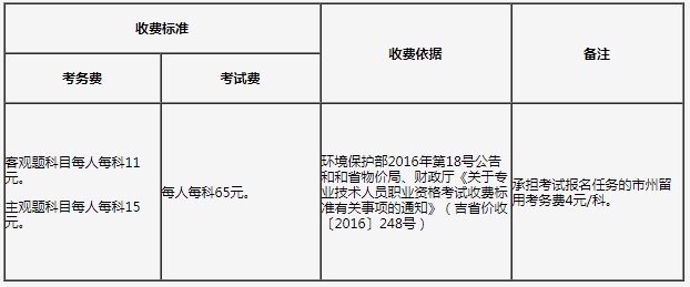 根据原环境保护部2016年第18号公告的相关规定和内蒙古自治区原发展计划委员会《关于核定各类专业技术资格、执业资格考试等收费标准的批复》(内计费字〔2002〕887号)的规定,每人收取考试报名费20元。客观题每人每科收取考务费61元,主观题每人每科收取考务费65元。