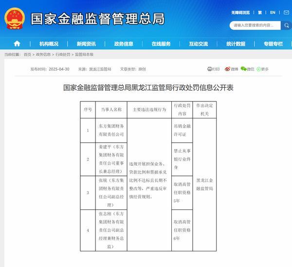 中国网财经5月6日讯 日前,国家金融监督管理总局黑龙江监管局(简称“黑龙江金融监管局”)发布相关行政处罚信息,东方集团财务有限责任公司(简称“东方集团财务公司”)因存在违规开展担保业务、贷款比例和票据承兑比例不达标且长期不整改等主要违法违规行为,严重违反审慎经营规则,黑龙江金融监管局决定吊销其金融许可证。