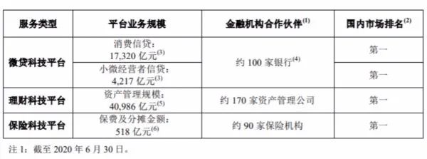 在微贷科技平台方面,蚂蚁集团首创数字化无抵押信用贷,先后推出花呗、借呗等,也与约100家银行业合作伙伴合作。截至6月30日,按平台促成的贷款余额规模计,蚂蚁集团是中国最大的线上消费信贷和小微经营者信贷科技服务商。截至今年6月末,微贷科技平台促成的消费信贷余额总计为17320亿元,促成的小微经营者信贷余额总计为4217亿元。