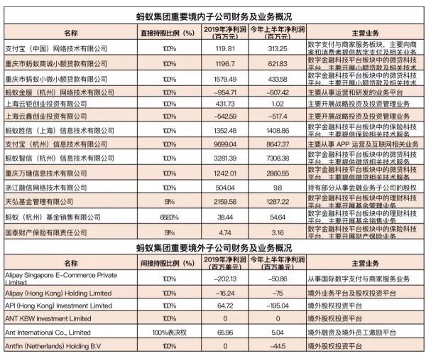 招股说明书显示,截至今年6月30 日,蚂蚁集团共有境内控股子公司70 家,境外控股子公司98家,参股的合营及联营公司58家。其中,重要子公司共有20家(14家重要境内子公司,6家重要境外子公司)。