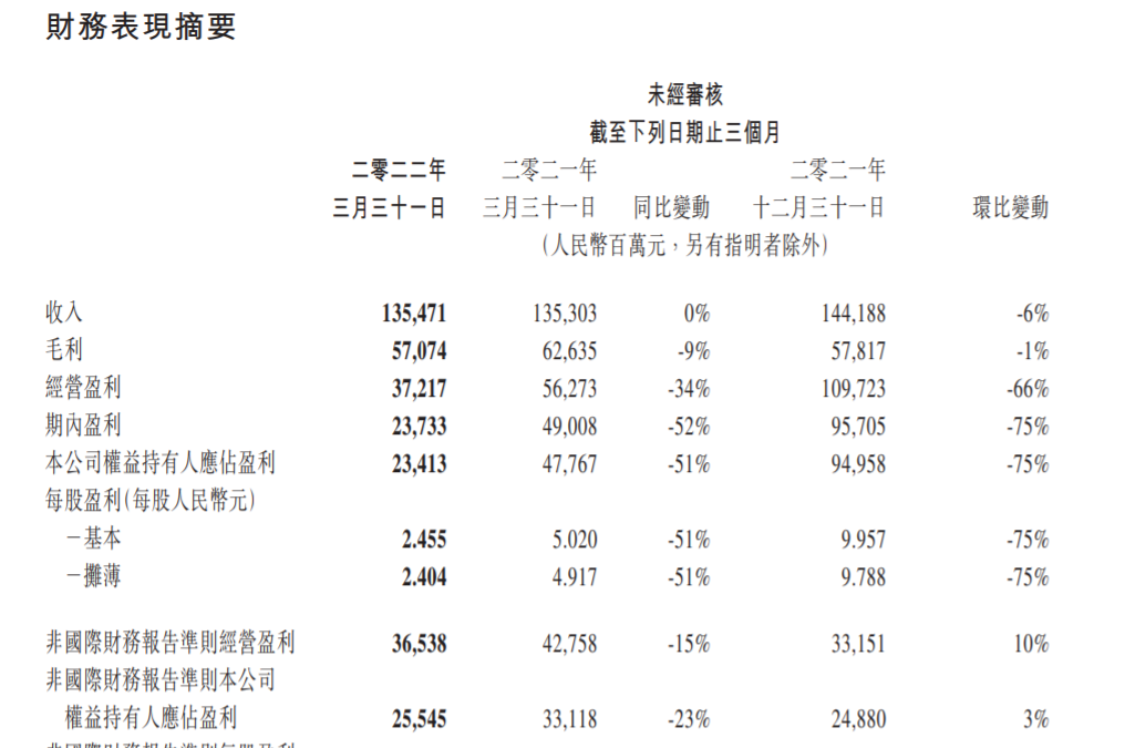 5月18日,腾讯发布2022年第一季度业绩报告,期内实现营收1354.71亿元,同比持平,环比下滑6%;毛利570.74亿元,同比下滑9%,环比下滑1%;非国际财务报告准则(Non-IFRS)净利润255亿元,同比下滑23%,环比增长3%。对于净利润下滑,腾讯方面解释称主要是由于成本及开支整体上涨程度快于收入,以及联营公司所作净贡献由盈利转为亏损所致。