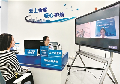 在国家税务总局广州市海珠区税务局办税服务厅,税务部门工作人员正和企业办税员与医保部门的工作人员远程连线,通过多方会谈,帮助企业解决医保缴费问题。