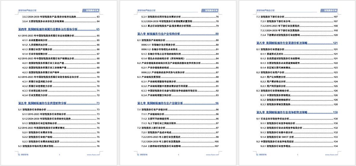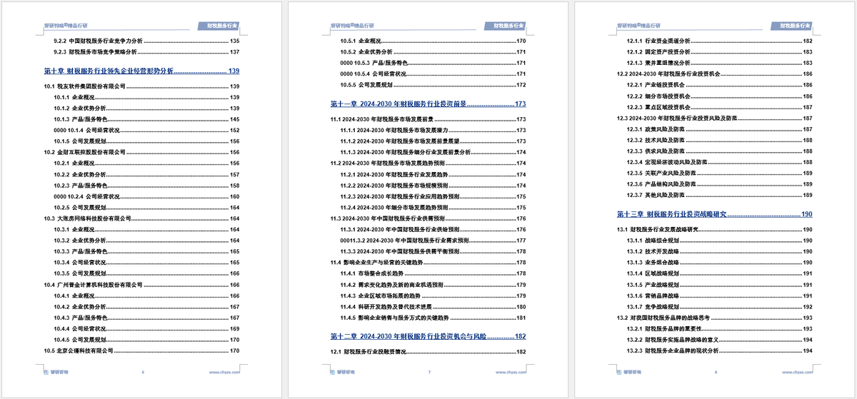 本报告分为发展概述、运行环境、产业现状、区域运行、竞争格局、重点厂商、发展战略、产业趋势等主要篇章,共计13章。涉及财税服务产值、市场规模等核心数据。