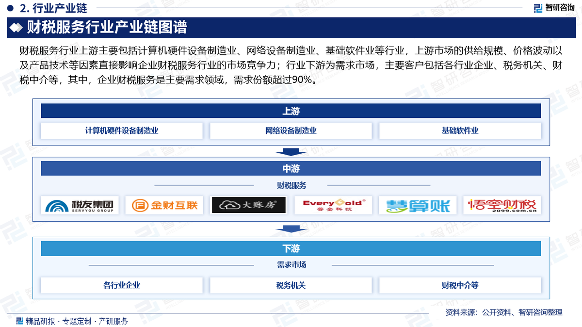 财税服务行业上游主要包括计算机硬件设备制造业、网络设备制造业、基础软件业等行业,上游市场的供给规模、价格波动以及产品技术等因素直接影响企业财税服务行业的市场竞争力;行业下游为需求市场,主要客户包括各行业企业、税务机关、财税中介等,其中,企业财税服务是主要需求领域,需求份额超过90%。