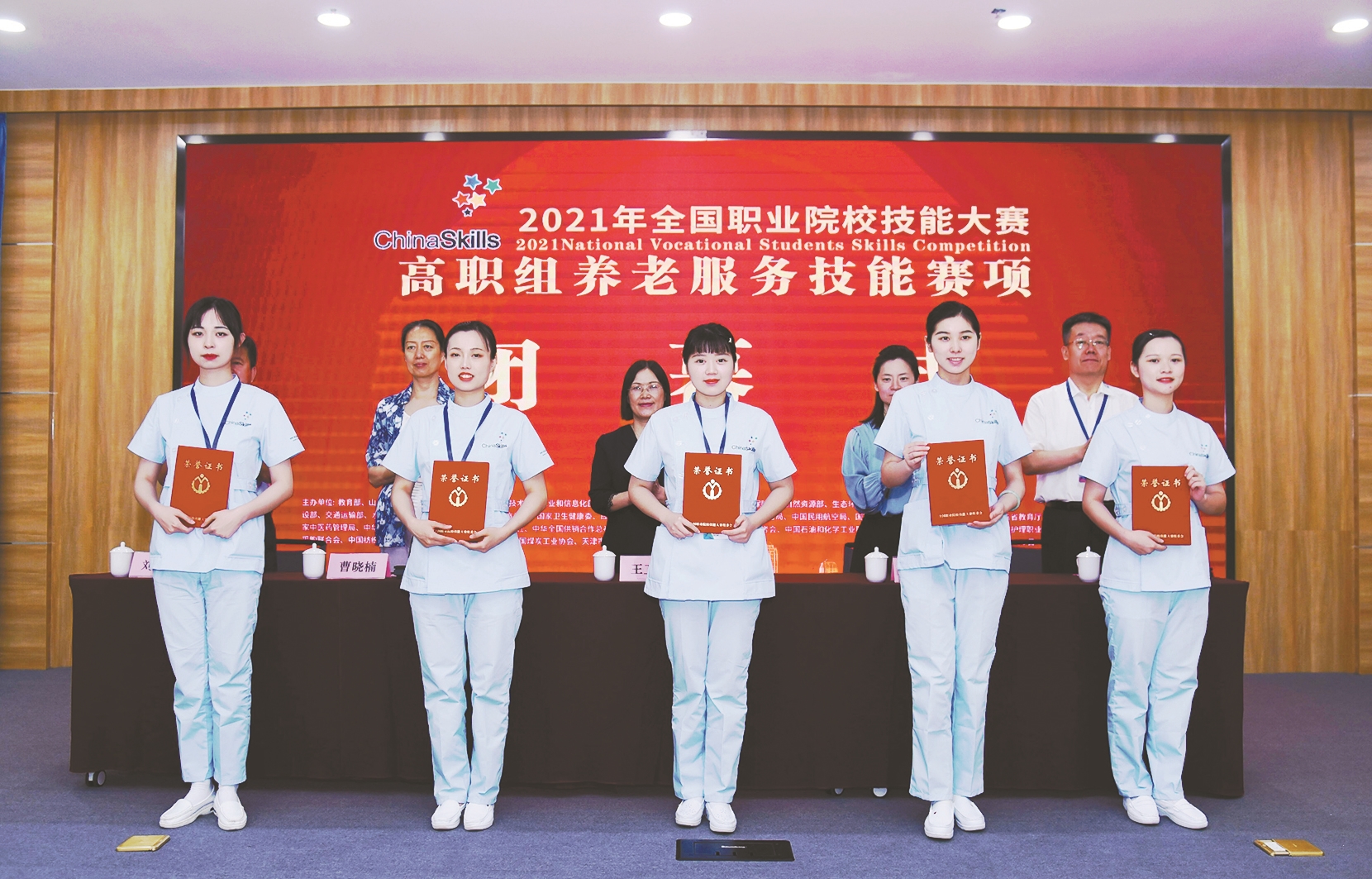 2021年全国职业院校技能大赛高职组养老服务技能赛,武汉民政职业学院学生何怡楚(右二)荣获二等奖。