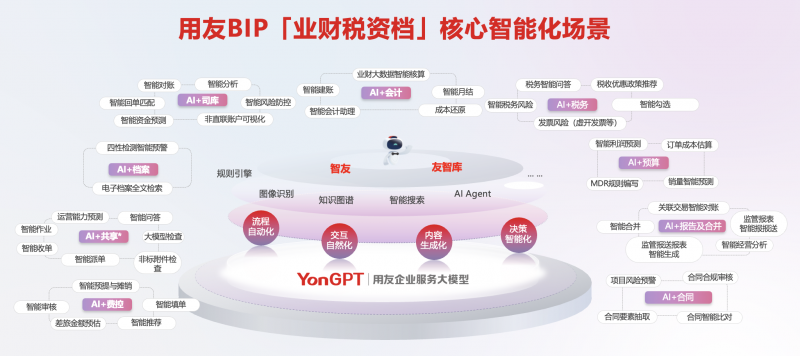 针对企业需求,基于自研的企业服务大模型YonGPT+通用大模型,融合自然语言处理(NLP)、多模态识别、预测分析模型等核心技术,用友BIP提供了业财税资档一体化的数智服务场景,帮助企业实现从商旅费控到共享、从核算到报告、从资金流动性到投融资、税务、档案、合同等全链路的数智化升级。