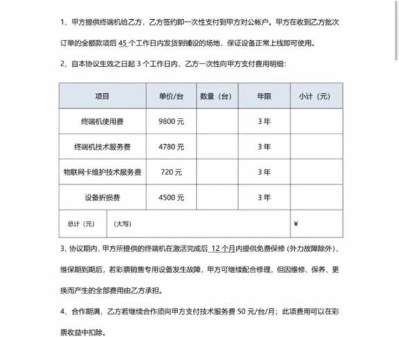 一位彩票机代理商告诉蓝鲸记者,引入彩票机需要3台起步,每台机器需要准备最少1万元的购票押金,合同期也是3年起。根据设备使用费19800元/台(包含提交审批手续,办理代销证,开通后台,设备安装调试,及售后服务)来计算,启动资金需要至少准备9万元左右。据该代理商介绍,整个过程周期只需45个工作日。