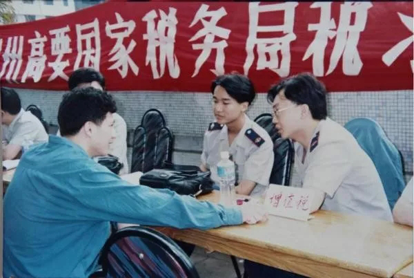 图为1995年,肇庆税务干部走上街头举办税法咨询活动