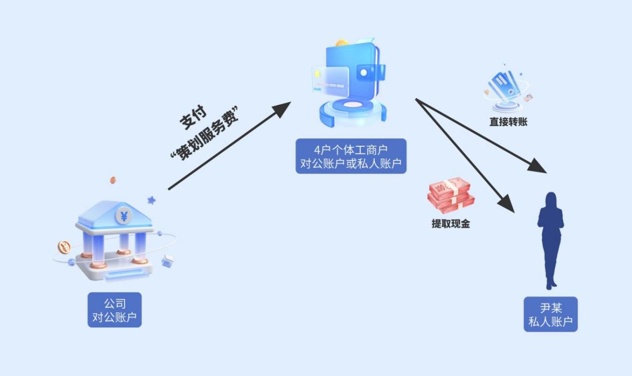 通过调取仁远医疗及4户个体工商户的银行账户数据,检查人员发现所有策划服务费均通过仁远医疗公账转出,部分费用转进个体工商户的公账,部分费用直接转进个体工商户注册人私人账户,资金经过多层迂回流转,其中大部分转至尹某私人账户,剩余部分直接从个体工商户的收款账户中取现。同时企业无法提供4户个体工商户履约策划服务的佐证材料,种种迹象表明,4户个体工商户并未向仁远医疗提供策划服务,在双方没有真实业务往来的情况下,开具高达546万余元服务费发票,涉嫌虚开。