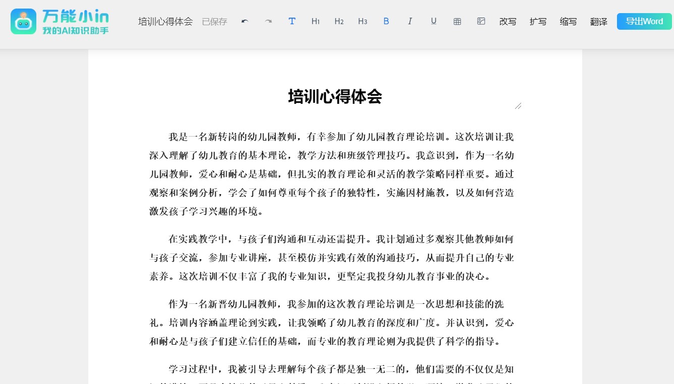 万能小in正好是你抒发内心所想的得力助手,一分钟3000字,个性化定制原创文章,再也不用反反复复的修改啦!