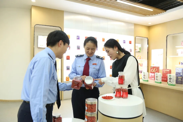 图为宁夏税务干部走进枸杞销售企业,了解经营情况并辅导企业准确适用并享受税费优惠政策。