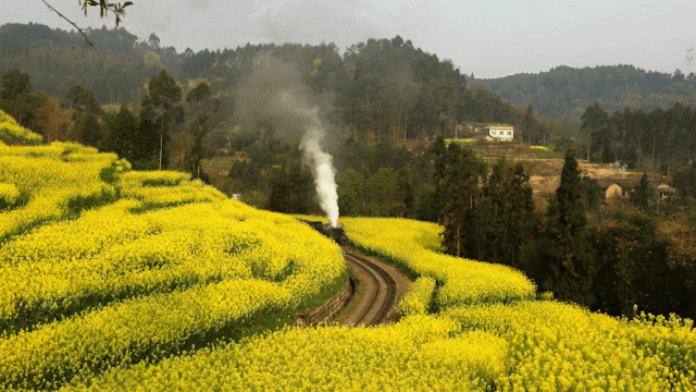 嘉阳国家矿山公园,是由废弃煤矿改造而成的景点,也是体验铁路文化和欣赏田园风光的绝佳去处。除了可以下到矿井中探秘,复古小火车也不可错过,每年的三四月份,一定要来犍为坐一次嘉阳小火车,穿越油菜花田,奔向复古浪漫的春天!