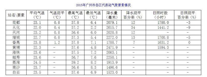 2015年,广州市天气气候具有“气温高、降水多、龙舟水偏重、台风影响大”的特点。全年平均气温23.3℃,比常年偏高0.8℃,各区年平均气温在22.0~24.5℃之间,其中番禺23.8℃,为当地年平均气温历史最高值,增城、花都分别为当地历史第二和第三高。与常年相比,全市平均气温整体偏高,各区年平均气温距平值在0.4~1.2℃之间。从全市平均气温的年变化来看,上半年气温一致偏高,下半年除11月明显偏高外,其他5个月平均气温与常年同期相近。6月全市平均气温高达28.9℃,为历史同期第二高,罕见地成为年内最热月份;1月全市平均气温仅14.1℃,是最冷月份。与常年同期相比,除7月、8月外,其余各月偏高,幅度在0.1~1.8℃之间。各区年极端最高气温在36.6~39.2℃,出现日期比较分散,6—8月均有,7月13日相对多些。年极端最低气温在2.2~8.3℃,主要出现在12月。
