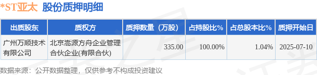 *ST亚太(000691)股东广州万顺技术有限公司质押335万股,占总股本1.04%