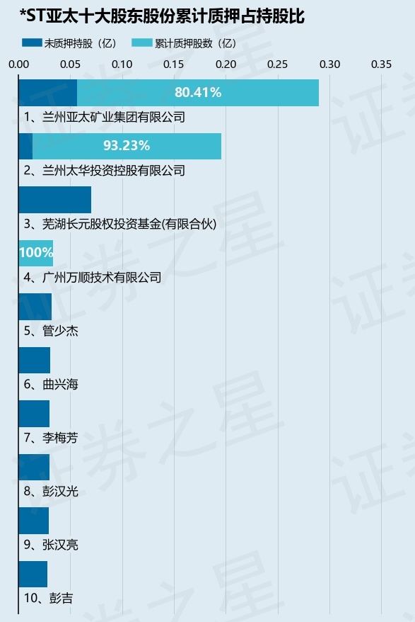 截止本公告日,股东兰州亚太矿业集团有限公司已累计质押股份2330.0万股,占其持股总数的80.41%,股东兰州太华投资控股有限公司已累计质押股份1825.72万股,占其持股总数的93.23%,股东广州万顺技术有限公司已累计质押股份335.0万股,占其持股总数的100.0%。本次质押后*ST亚太十大股东的累计质押股份占持股比例(占持股比例的计算以公司最新一期财务报表公布的十大股东的持股总数为基准)见下图: