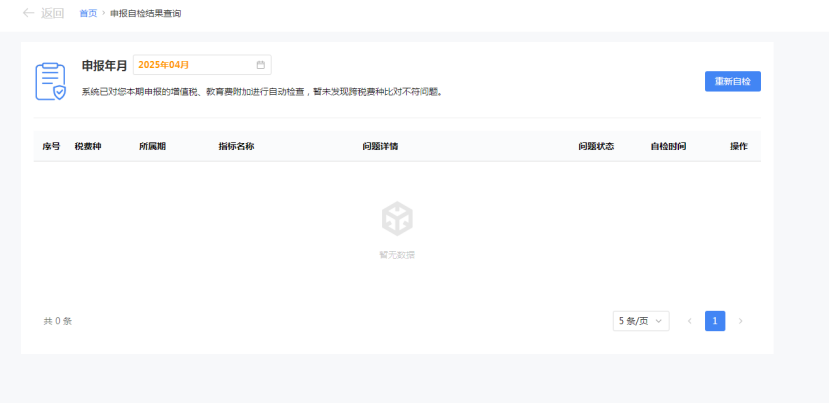 (2)当对应申报年月已完成自检,且不存在未解决的比对不符问题时,纳税人可以进行“重新自检”操作。