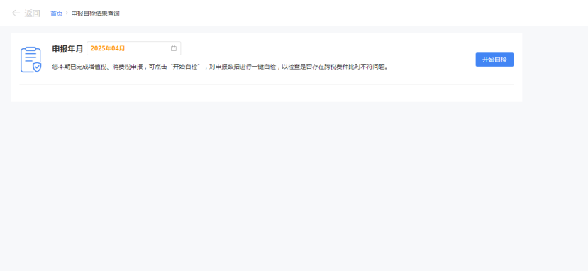 (4)当对应申报年月未完成自检,且未申报可以进行自检的税费种时,“开始自检”按钮处于置灰状态,不可点击。
