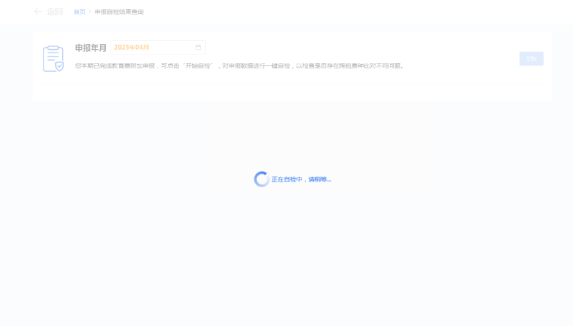 纳税人点击【开始自检】后,系统对纳税人所选申报年月中已申报并且配置了相应自检规则的申报表进行检测。