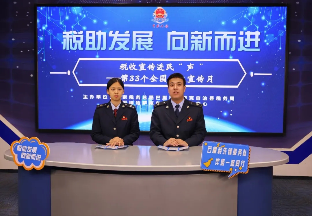 在新疆,国家税务总局巴里坤哈萨克自治县税务局“石榴籽”先锋服务队走进演播厅,开展“税收宣传进民‘声’”活动。