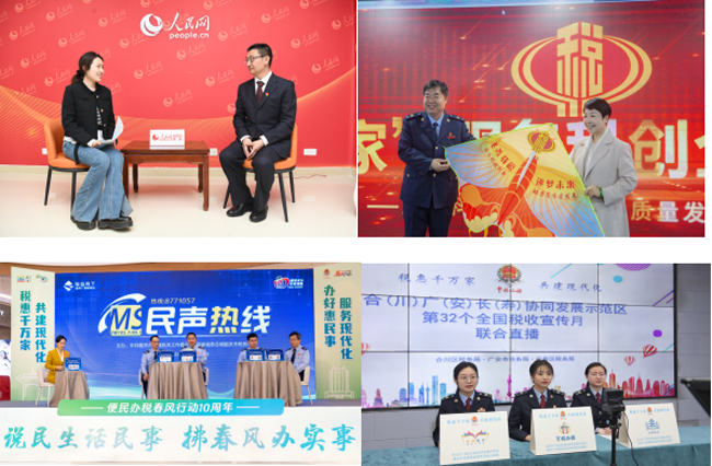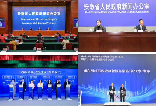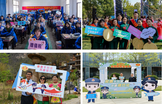 (三)创新活动载体,线上线下全覆盖。各地税务机关通过开展线上云端互动、税媒合作,线下趣味横生、形式多样的活动,对税收现代化举措、便民服务等内容进行全方位宣传。黑龙江省局、云南省局通过地方人民政府新闻办公室举行新闻发布会,广东省局、重庆市局、贵州省局、江苏南京市局举办主题灯光秀,滚动播放各类税收宣传标语,营造浓厚税收宣传氛围。