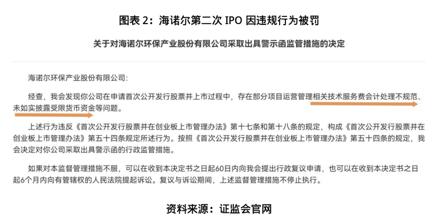 证监会现场检查发现,海诺尔在申请IPO的过程中,存在部分项目运营管理相关技术服务费会计处理不规范、未如实披露受限货币资金的问题。上述情况未能准确反映公司的财务状况,影响了信息披露的真实性和完整性。基于此,2020年4月,证监会对海诺尔采取出具警示函的行政监管措施。