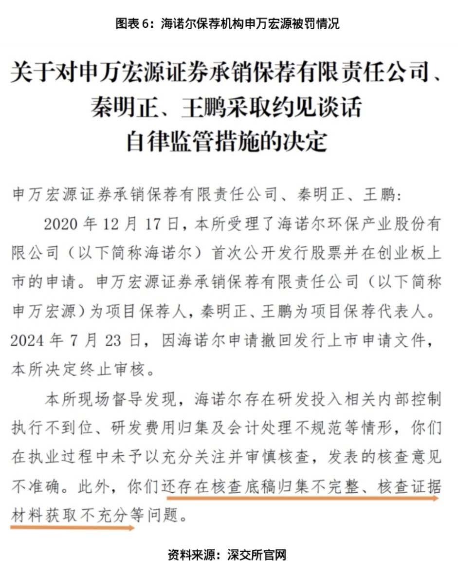 在此次对中介机构的处罚中,深交所指出,申万宏源两名保荐代表人秦明正、王鹏,以及信永中和两名会计师廖继平、夏翠琼在执业过程中,均对海诺尔内部控制执行不到位等问题未予以充分关注并审慎核查,发表的核查意见不准确。此外,申万宏源的保荐代表人还存在核查底稿归集不完整、核查证据材料获取不充分等问题。基于此,深交所对上述保荐代表人和会计师采取约见谈话的自律监管措施。
