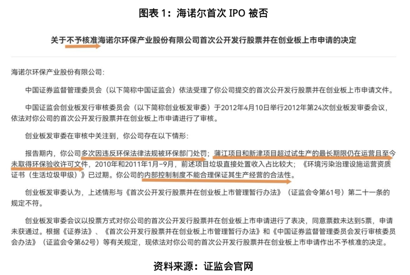 彼时,发审委审核发现,海诺尔在报告期内多次违反环保法律法规、部分项目未取得环保验收许可文件、《环境污染治理设施运营资质证书(生活垃圾甲级)》已过期。基于海诺尔内部控制制度不能合理保证其生产经营的合法性,发审委否决了海诺尔的上市申请。