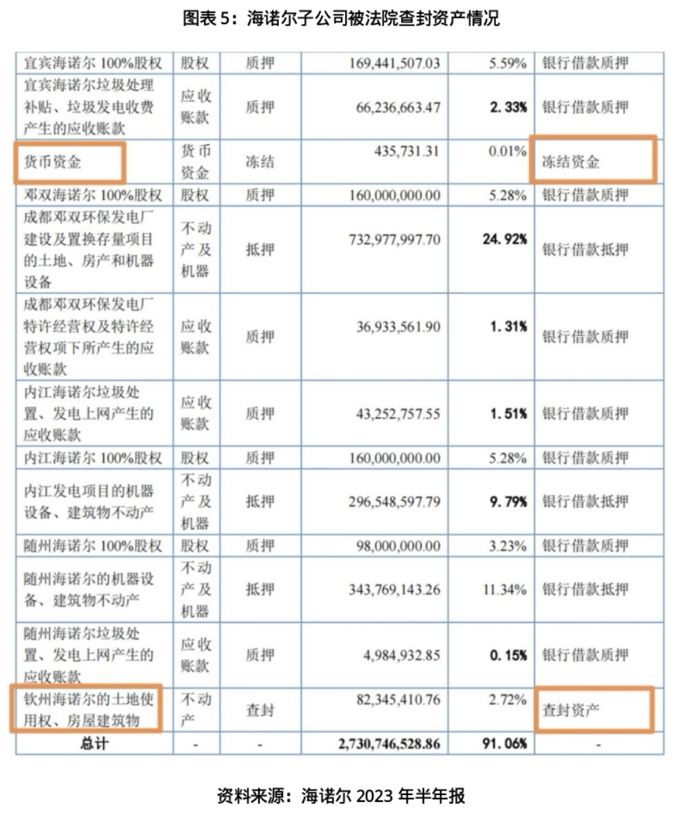 上述半年报显示,该查封资产,系钦州海诺尔、绿能新源因劳务纠纷案而被法院查封,截至该半年报出具日,该查封事项仍未解除。遭冻结的43.57万元货币资金,则系海诺尔全资子公司四川齐伦达建设工程有限公司因工程分包合同纠纷案而被法院冻结的银行存款。
