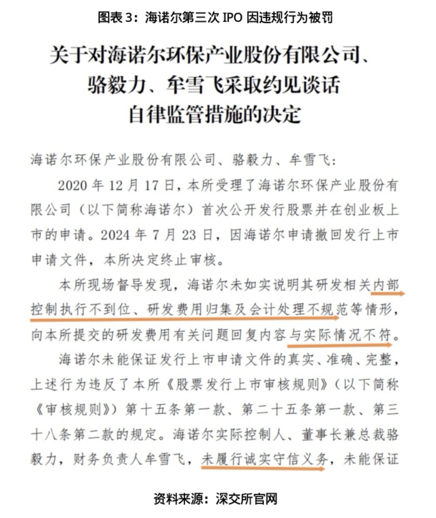根据深交所文件披露,此次监管行动源于对海诺尔第三次创业板IPO的现场督导。深交所通过现场督导发现,海诺尔未如实说明其研发相关内部控制执行不到位、研发费用归集及会计处理不规范等情形,向深交所提交的研发费用有关问题回复内容与实际情况不符。基于此,深交所认定海诺尔“未能保证发行上市申请文件的真实、准确、完整”。