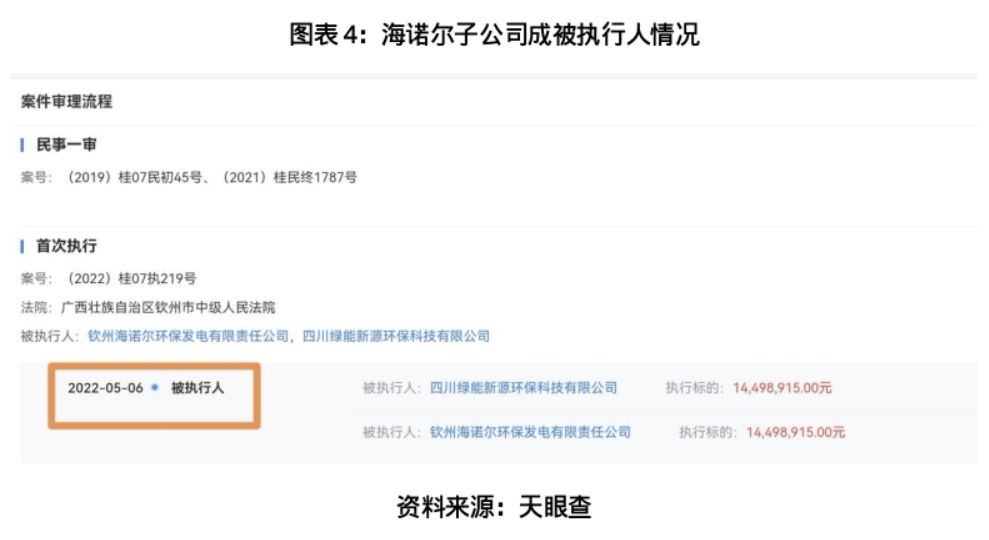 天眼查显示,在第三次创业板IPO过会后不久,2022年5月,海诺尔旗下两家全资子公司——四川绿能新源环保科技有限公司(以下简称“绿能新源”)与钦州海诺尔环保发电有限责任公司(以下简称“钦州海诺尔”)便被法院列入被执行人名单,执行标的金额均为1449.89万元。这反映出海诺尔子公司层面存在的债务纠纷或法律风险已进入实质执行阶段。