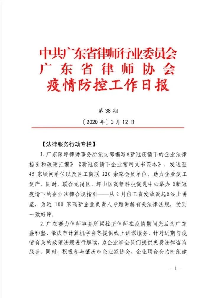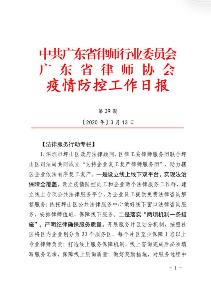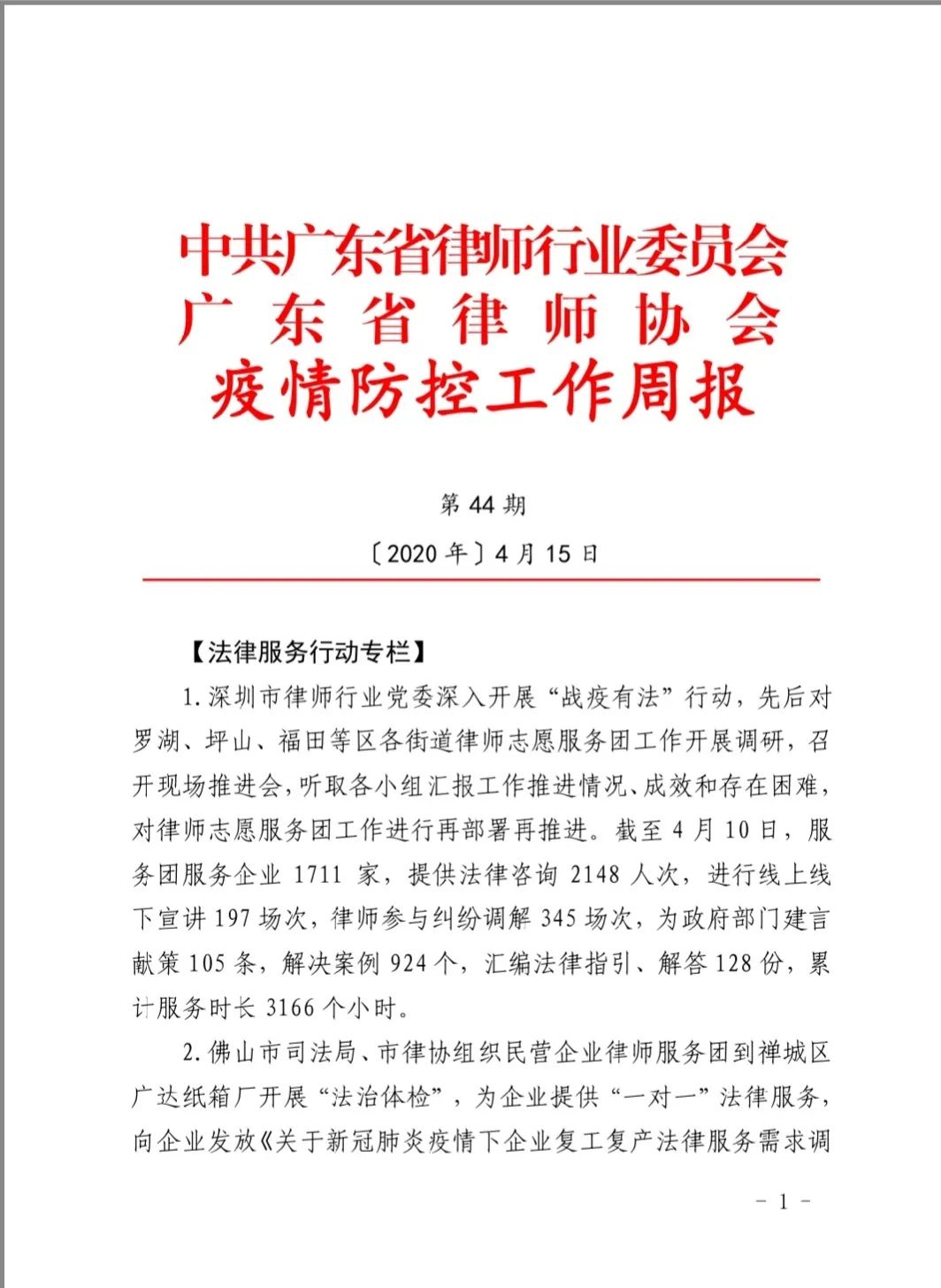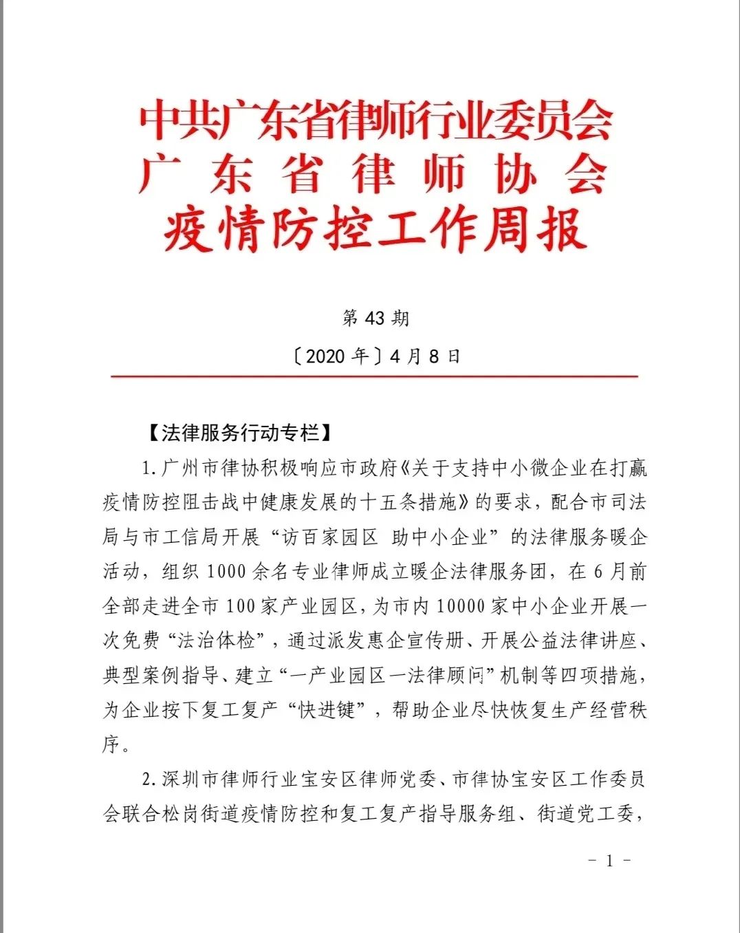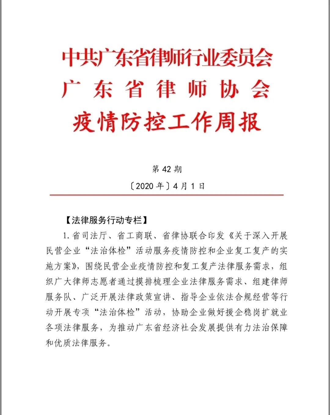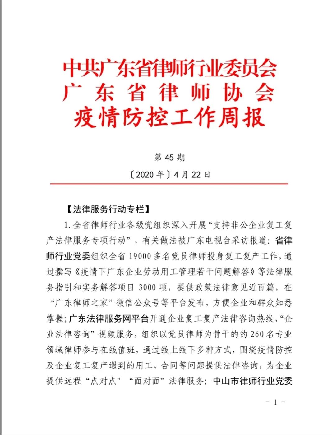 1.全省律师行业各级党组织深入开展“支持非公企业复工复产法律服务专项行动”,有关做法被广东电视台采访报道:省律师行业党委组织全省19000多名党员律师投身复工复产工作,通过撰写《疫情下广东企业劳动用工管理若干问题解答》等法律服务指引和实务解答项目3000项,提供政策法律意见近百篇,在“广东律师之家”微信公众号等平台发布,方便企业和群众知悉掌握;广东法律服务网平台开通企业复工复产法律咨询热线、“企业法律咨询”视频服务,组织以党员律师为骨干的约260名专业领域律师参与在线值班,通过线上线下多种方式,围绕疫情防控及企业复工复产遇到的用工、合同等问题提供法律咨询,为企业提供远程“点对点”“面对面”法律服务;中山市律师行业党委先后组织防疫指挥部法律顾问团,以及律协防疫和复工复产法律顾问团,为企业免费开展“法治体检”,及时解答涉复工复产相关法务问题;江门市蓬江区律师行业党委成立近50人的“区律师行业疫情防护志愿服务队”,并建立律师行业疫情防控志愿者临时党支部,投身基层一线支援社区疫情防控,及时为企业和个人提供法律服务。
