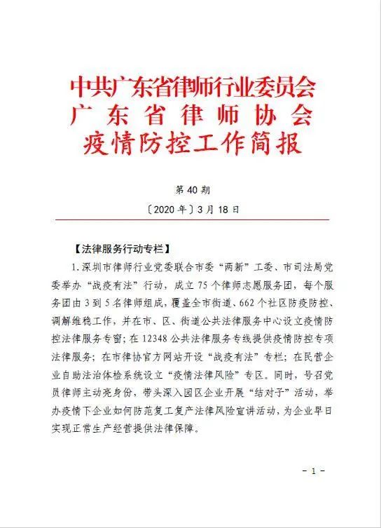 面对疫情,广东律师主动作为,建言献策,充分发挥专业优势、全力提供法律服务,为依法抗疫筑造坚强后盾。省律师行业党委、省律师协会从2月4日开始,梳理全省律师行业疫情防控工作,编写《疫情防控工作简报》,向上级机关报告全省律师行业抗击疫情工作开展情况、律所及律师先进事迹、疫情期间宣传工作效果等信息,目前已编发45期。广东律师之家将同步推送简报相关内容。敬请关注……